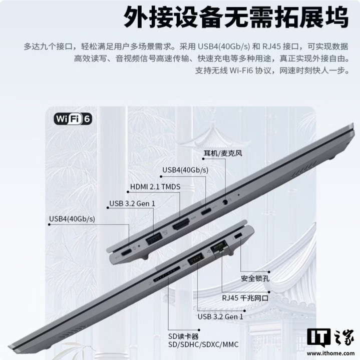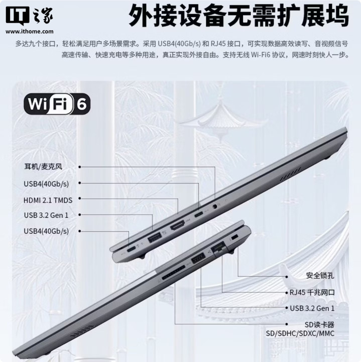 此外,这款电脑支持5600MT/sDDR5内存,最高可扩展至64GB,带有两个M.22280PCIe4.0固态硬盘插槽,至高可扩容至6TB,配备1080P摄像头,支持WindowsHello人脸解锁。